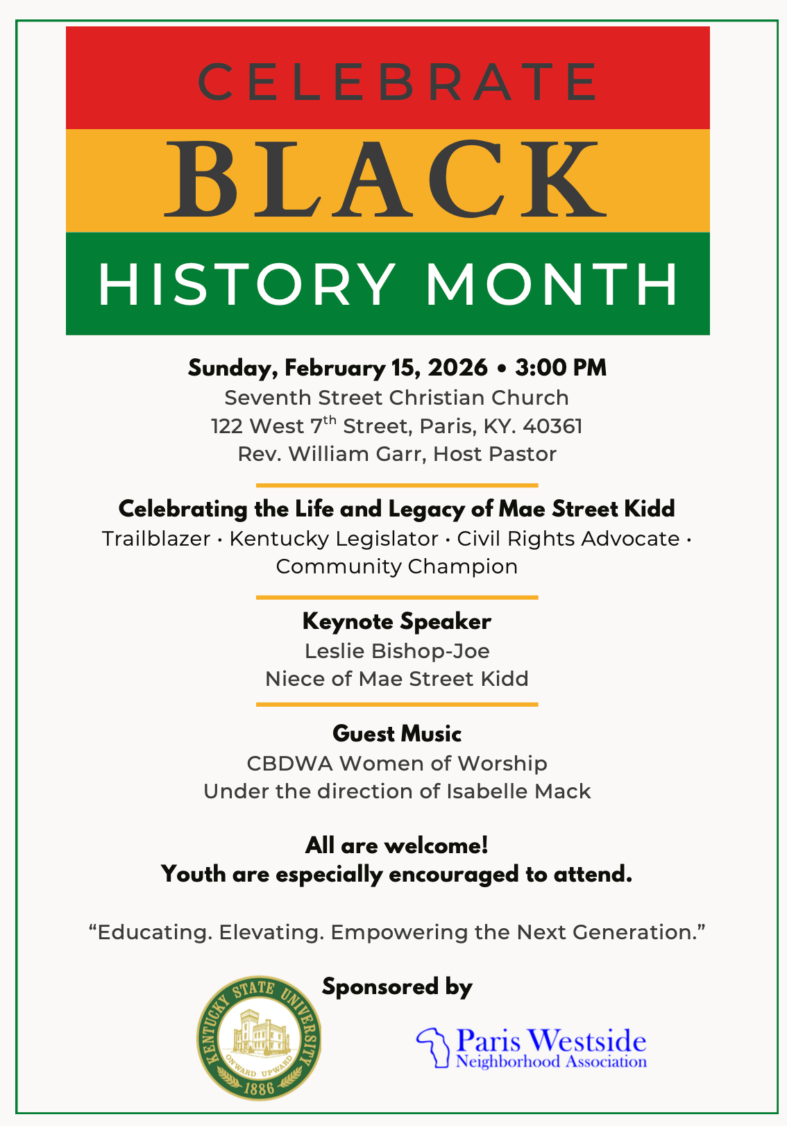 Keynote Speaker Leslie Bishop-Joe Niece of Mae Street Kidd All are Welcome! Youth are urged to attend.